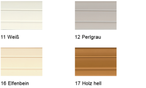 Für Kasten, Leisten sowie Profilekönnen Sie eine Farbe aus den Reflexa Wohnfühlfarben ohne Mehrpreis wählen. Sollte Ihnen diese Auswahl allerdings nicht genügen, erhalten Sie jede andere Farbe als Option. Wenn Sie sich für einen Behang aus Kunststoff entscheiden, stehen Ihnen sieben Farbtöne zur Verfügung. Ihre Aluminium-Profile erhalten Sie in 16 verschiedenen Designs.